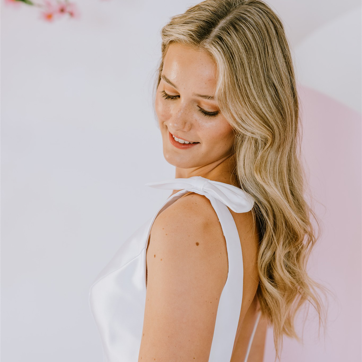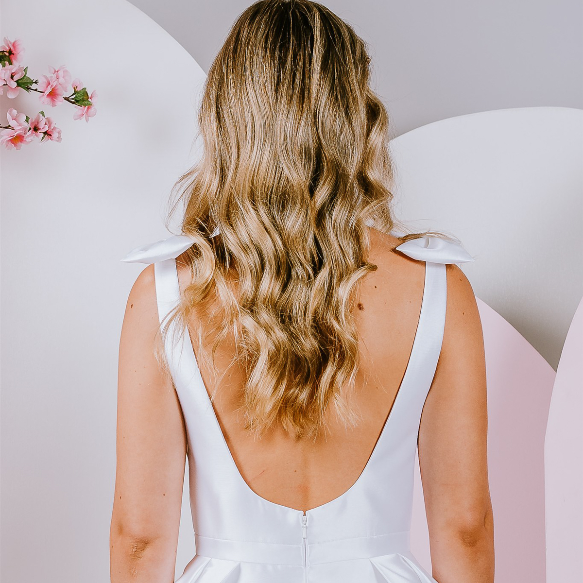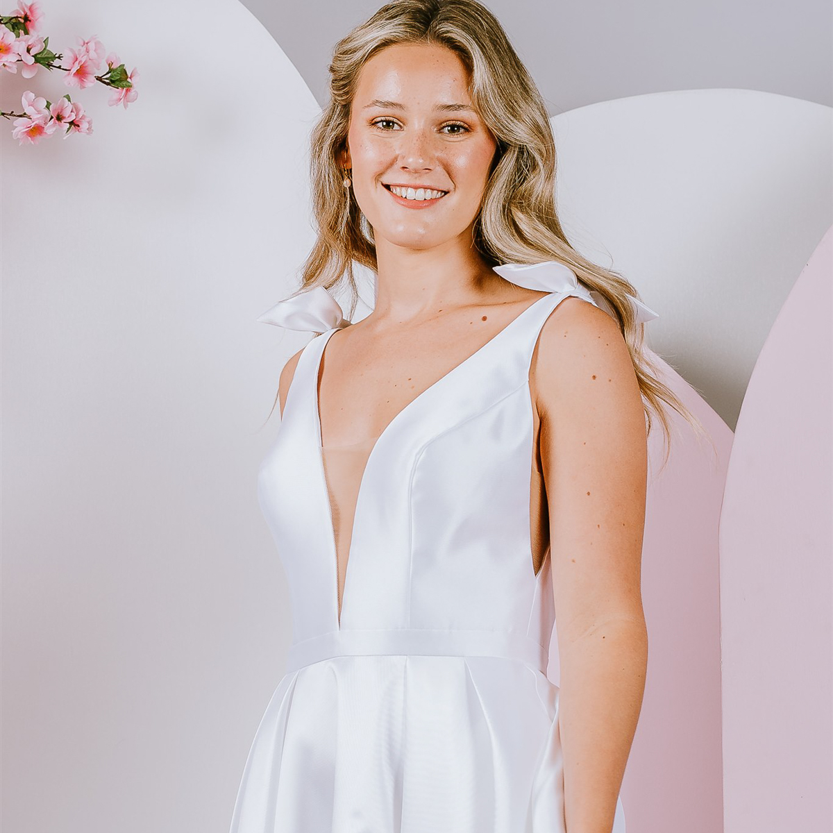 Beautiful mikado gown with sweet bows on the shoulder and deep v neckline.